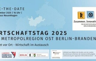 Sehr geehrte Damen und Herren, wir laden Sie hiermit herzlich ein, sich den Termin für den Wirtschaftstag 2025 der Metropolregion Ost Berlin-Brandenburg vorzumerken. Die Veranstaltung wird gemeinsam vom Landkreis Märkisch-Oderland, dem Berliner Bezirk Marzahn-Hellersdorf und den Projektkommunen ausgerichtet. Wann: 20. November 2025, ab 16.00 Uhr Wo: Bürgerhaus Neuenhagen, Hauptstraße 2, Weiterlesen